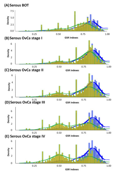 Histograms of global GSR indices of functionomes for serous BOTs, all stages of serous ovarian carcinomas (yellow green), and control groups (blue). Different distributions of the functionomes among five case sample groups and control groups are shown with statistical significance (p < 0.05). The normal control group (blue, right) was used as the control and is the same in all panels. Peaks in distribution were observed (yellow green), indicating dysregulated biomolecular functionomes of serous BOTs and all stages of serous ovarian carcinomas. (A–E) Corrected GSR indices of serous BOTs: 0.7036 (A); FIGO stage I: 0.7230 (B); FIGO stage II: 0.6976 (C); FIGO stage III: 0.6355 (D); and FIGO stage IV: 0.6147 (E).