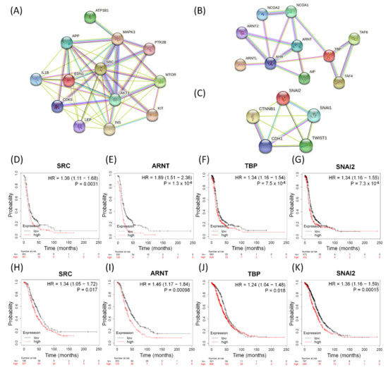 The significant biomarkers influencing serous ovarian tumors. (A–C) Panels display identified potential involving DEGs subjected to protein–protein interaction (PPI) analysis with interactive network from the STRING database (https://string-db.org (accessed on 21 July 2021)) with intensive interactions. (A) All 13 relevant DEGs sorted from the top 25 common dysregulated GO terms, (B) all ten DEGs in-volved in dysfunctional aryl hydrocarbon receptor (AHR) binding pathway, and (C) five featured DEGs among relevant biomarkers associated with EMT. (D–K) The four meaningful DEGs (SRC, ARNT, TBP and SNAI2) associated with poor survival outcomes. PFS: (D) SRC, (E) ARNT, (F) TBP, (G) SNAI2; OS: (H) SRC, (I) ARNT, (J) TBP, and (K) SNAI2 in serous ovarian carcinomas. The hazard ratios of the PFS of SRC, ARNT, TBP, and SNAI2 were 1.36 (1.11–1.68, p = 0.0031), 1.89 (1.51–2.36, p = 1.3 × 10−8), 1.34 (1.16–1.54, p = 7.5 × 10−5), and 1.34 (1.16–1.55, p = 7.3 × 10−5), respectively. The hazard ratios of the OS of SRC, ARNT, TBP, and SNAI2 were 1.34 (1.05–1.72, p = 0.017), 1.46 (1.17–1.84, p = 0.00098), 1.24 (1.04–1.48, p = 0.018), 1.36 (1.16–1.59, p = 0.00015), respectively.