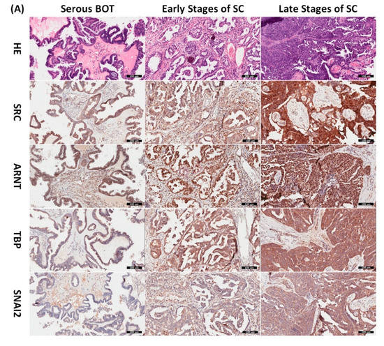 Since the inferred biomarkers including SRC, ARNT, TBP, and SNAI2 from the previous analysis were assumed to be influential in the tumorigenesis of serous ovarian tumors, we gathered relevant clinical samples from a cohort of patients (serous BOT, n = 9; serous ovarian carcinoma, n = 41, including n = 8, 2, 23, and 8 for FIGO stages I–IV, respectively) to explore the clinical characteristics and verify the specific manifestations of the four abovementioned selected DEGs that were determined to participate in the pathogenetic mechanisms of serous ovarian tumors. Because the number of samples in each group was inconsistent, we combined groups as follows to facilitate verification and comparison: serous BOTs, early-stage serous ovarian carcinomas (FIGO stages I and II), and late-stage serous ovarian carcinomas (FIGO stages III and IV). We then performed IHC staining of anti-SRC, anti-ARNT, anti-TBP, and anti-SNAI2 antibodies separately among the three modified disease groups to clinically assess the significant manifestation of SRC, ARNT, TBP, and SNAI2. Professional pathologists verified and interpreted the results evenly and repeatedly throughout the whole diagnostic process using SPSS software (IBM SPSS Statistics version 22.0 for Windows, IBM Corp., Armonk, NY, USA) to quantify the immunoscores of SRC, ARNT, TBP, and SNAI2. The organized results clearly showed that the highest biomarker expression levels tended to occur in the group of late-stage serous ovarian carcinoma, followed by the early-stage group, and lastly the serous BOT group (Figure 4A). We also found that the highest mean values of expression levels for all these biomarkers (SRC, ARNT, TBP, and SNAI2) belonged to the late-stage serous ovarian carcinoma group, with clear increasing trends from the serous BOT group to the late-stage group, and the calculated mean values of the relevant biomarkers were statistically significant (Figure 4B). The detailed results of all scores for relevant featured biomarkers of clinical samples and detailed clinical characteristics of the patients (grade, menopausal status, the presence of BRCA1, BRCA2 mutation, overall survival, and Ca125 level) are listed in Table S6. These results were in accordance with our inferences, implying that many dysregulated functionomes deduced from the integrative GO-based enrichment analysis are dedicated to the pathogenetic mechanisms of serous ovarian tumors. Similarly, these validated results also demonstrated that the dysfunctional AHR binding pathway played a role in the tumorigenesis of serous ovarian tumors. Furthermore, this verification supported the association between EMT and tumor progression. All these significant results confirmed the importance of the previously proposed DEGs and related pathogenic tumorigenesis for serous ovarian tumors.
