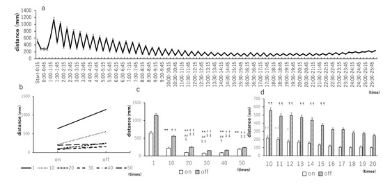 Light–dark test with 5-min intervals repeated 50 times. (a) Distance traveled by zebrafish larvae when light and dark stimuli were alternately repeated 50 times at 5-min intervals after being acclimated to a dark place for 1 h. As the number of repetitions increases, the traveled distance becomes smaller and more constant; (b) distance when the light is on and off at arbitrary numbers of repetitions (1st, 10th, 20th, 30th, 40th, and 50th). At all points, the traveled distance is larger when the light is off than when the light is on. After the 10th repetition, there are almost no changes in the traveled distance; (c) Tukey–Kramer test results; (d) Dunnett’s test results, where the 1st to 10th repetitions were extracted and tested using the 10th repetition as reference. * p < 0.05 vs. 1 (on), ** p < 0.01 vs. 1 (on), †† p < 0.01 vs. 1 (off) (Tukey–Kramer test). ¶ p < 0.05 vs. 10 (off), ¶¶ p < 0.01 vs. 10 (off) (Dunnet’s test). Values are presented as mean ± SE (n = 42).
