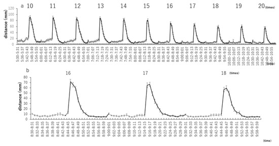 These results do not clearly imply that zebrafish larvae constantly move in dark environments, and it must be noted that the timing of light stimulation also plays an important role. Additionally, the traveled distance stabilizes at the 16th repetition of the light/dark stimuli at 15-min intervals, and it takes 9 h to complete the 16 repetitions. In contrast, the traveled distance stabilizes at the 5th repetition of the light/dark stimuli at 5-min intervals, which only takes 1 h and 50 min to complete. In this study, the time of habituation to the study conditions was set to 1 h. Considering this acclimation time, it is expected that the time required to obtain more stable data will be shortened. Although more detailed data were not included in this study, we examined the effects of different time intervals of light/dark stimulation, specifically, intervals of 10 min, 3 min, and 1 min (Figure S2). The traveled distance of zebrafish took longer to stabilize in the 10-min intervals than in the 5-min intervals. Sufficient travel distance was not obtained for the 3-min intervals, and the data varied as a consequence. The 1-min intervals varied from start to finish. Although we did not analyze any other intervals of time, it seems that light/dark stimuli at 5-min intervals are appropriate.