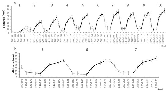 Distance traveled by zebrafish larvae in 1 min with specific numbers of repetitions of light–dark stimuli at 5-min intervals. (a) Distances traveled by zebrafish larvae from the first to the 10th repetitions were analyzed every minute for a more detailed assessment of this variable. (b) Analysis of stable 5th to 7th distance traveled.