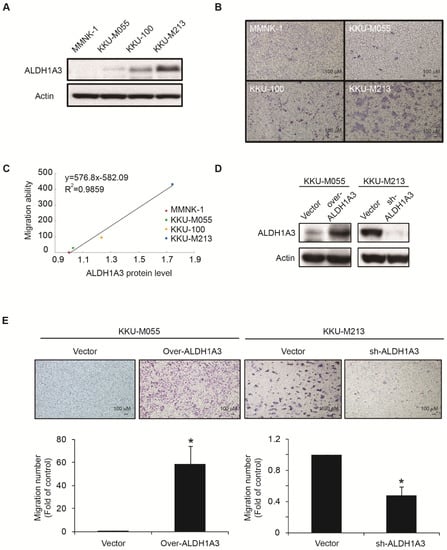 ALDH1A3 expression influences the migration ability in cholangiocarcinoma cell lines. (A) Total lysates (20 μg) from the normal cholangiocyte cell line (MMNK-1) and three cholangiocarcinoma cell lines (KKU-M055, KKU-100, and KKU-M213) were subjected to Western blot analysis using an anti-ALDH1A3 antibody as the probe, and β-actin signals were used as loading controls. (B) The cell migration ability of all cell lines was analyzed using Transwell migration assays. (C) Correlation of protein expression levels of ALDH1A3 with migration abilities. (D) Total lysates (20 μg) prepared from the vector- and ALDH1A3-overexpressing KKU-M055 cells and vector- and ALDH1A3-knockdown KKU-M213 cells, respectively, were subjected to Western blot analyses using antibodies against ALDH1A3. β-actin signals were used as loading controls. (E) The cell migration abilities of all KKU-M055 and KKU-M213 cells were analyzed using Transwell migration assays. The quantitative results shown in the bottom panels are the mean ± standard deviation of three independent experiments. * p < 0.05 compared with the respective vector cells by the Student’s t test.