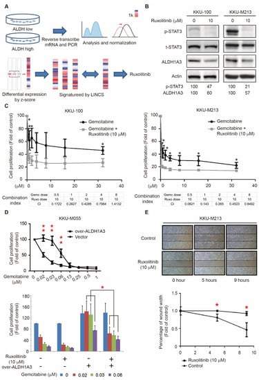 In a previous study, we established the ALDH1A3-overexpressing and -knockdown HuCCT1 clones as the ALDHhigh and ALDHlow cells, respectively, and determined how ALDH expression affects their migration abilities [16]. To identify drugs that can inhibit cell migration, we utilized the LINCS program to analyze the gene signatures of ALDHhigh and ALDHlow HuCCT1 cells and obtained the potential drug, ruxolitinib, a JAK2 inhibitor (Figure 2A, Table S1). To validate the LINCS results, we treated KKU-100 and KKU-M213 cells with 10 μM ruxolitinib for 8 and 3 h, respectively; ruxolitinib inhibited the expression of ALDH1A3 (Figure 2B). In addition, we examined the expression level of STAT3 and its phosphorylation and found ruxolitinib to effectively inhibit STAT3 activation.