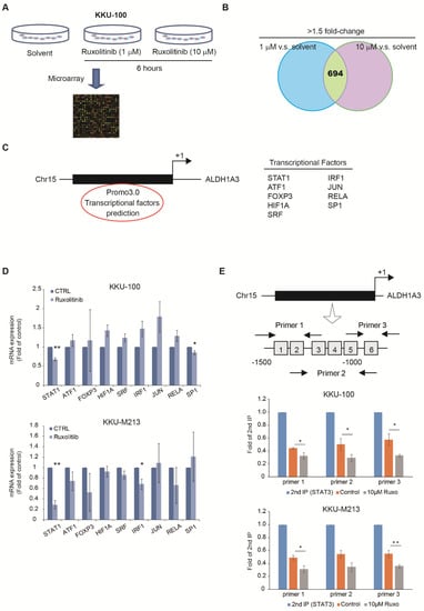 Effects of ALDH1A3 via functions of STAT1 and STAT3. (A) The gene signatures of KKU-100 cells cultured for 6 h with or without low doses (1 μM) or high doses (10 μM) of ruxolitinib were analyzed using Ingenuity Pathway Analysis (IPA). (B) The scheme of different gene signatures of KKU-100 cells was validated by IPA. (C) The nine putative transcription factors that correlated with ALDH1A3 and ruxolitinib were predicted using the PROMO 3.0 software. The lists of transcription factors are listed in the right panels. (D) Total RNA (5 μg) was isolated from the KKU-100 and KKU-M213 cells and subjected to RT–qPCR analyses to determine the mRNA levels of predicted transcription factors, including STAT1, ATF1, FOXP3, HIF1A, SRF, IRF-1, JUN, RELA, and SP1. Data are the mean ± standard deviation of three independent experiments. * p < 0.05 and ** p < 0.01 compared with the respective control group by the Student’s t test. (E) Schematic of the upstream promoter region of the ALDH1A3 gene with six predicted STAT1-binding sites (1–6). The region amplified in the re-ChIP assay is indicated by arrows (primers 1–3). The DNA samples represent yields of the secondary immunoprecipitation (second IP), control, and drug-treated groups (anti-pSTAT1 and p-STAT3). Data are the mean ± standard deviation of three independent experiments. * p < 0.05 and ** p < 0.01 compared with the respective control group by the Student’s t test.