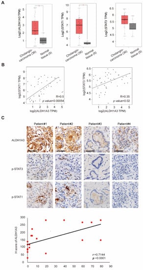 Expression of STAT1, STAT3, and ALDH1A3 in patients with cholangiocarcinoma. (A) Relative mRNA expressions of ALDH1A3, STAT1, and STAT3 from TCGA databank in cholangiocarcinoma (n = 36) and control samples (n = 9). * p < 0.05 by Mann–Whitney U test. (B) Spearman’s rank correlation between the mRNA levels of ALDH1A3, STAT, and STAT3. The correlation coefficients r and P values were obtained using GEPIA and are shown in each panel. (C) Upper: Representative imaged of immunohistochemical nuclear staining of ALDH1A3, pSTAT1 (Y701-phosphorylated STAT1), and pSTAT3 (Y705-phosphorylated STAT3) in human cholangiocarcinoma specimens. Scale bar = 50 μm. Lower: Spearman’s rank correlation coefficient r and P values are shown in the panel (n = 24).