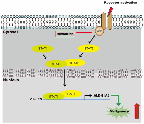 Several studies have discussed the ALDH isoenzyme and downstream signal transduction in various cancer types [27,28,29,30,31]. To explore how ruxolitinib, a JAK2 inhibitor, reduces ALDH1A3 expression in cholangiocarcinoma cells, we used a microarray to investigate the transcription factors that fluctuate the most when applying different ruxolitinib concentrations to a cholangiocarcinoma cell line. On the basis of the results, we hypothesized that ruxolitinib inhibits ALDH1A3 via the JAK/STAT1/3 pathway and reduces cell proliferation and migration ability. Shao et al. highlighted that the essential role of ALDH1A3 in lung cancer stemness is associated with the STAT3 pathway [30]. They also reported that the JAK2 inhibitor can reduce ALDH+ lung cancer cells. In their review, Duan et al. concluded that JAK2 may be a potential pathway for cancer therapy through ALDH1A3 [31]. Our study results provide an excellent in vivo proof of these hypotheses.