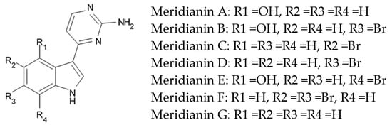 Indol alkaloids meridianins isolated from ascidian Aplidium meridianum [42] and variolin B found in Antarctic sponge Kirkpatrickia varialosa [43] became prototypes of the novel synthetic derivatives as well as hybrid molecules meriolins obtained from those compounds. The natural meridianins A, B, C, D, E, F, and G are brominated and/or hydroxylated 3-(2-aminopyrimidine)-indoles differing in the bromine and/or hydroxyl substitution (Figure 1) [44,45]. Meridianins were shown to inhibit various protein kinases, such as CDKs, glycogen synthase kinase-3, cyclic nucleotide-dependent kinases, and casein kinase 1 [46] playing important role in the cancer cell lifecycle. They also prevent cell proliferation and induce apoptosis due to their ability to penetrate cellular membrane and disturb activity of kinases responsible for cell division and death. Meridianin E was experimentally proved an effective protein kinase inhibitor with high selectivity regarding CDK1 and CDK5 [46]. One of the meridianin C derivatives substituted at the C-5 position was found to be strong and selective inhibitor of pim kinases (including pim-1, pim-2, and pim-3 overexpressed in various cancer cell types) with IC50 values within a nanomolar concentration range [47].