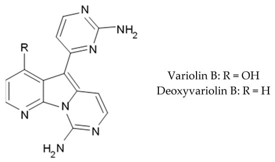 Variolins (A, B, deoxyvariolin B, and N(3′)-methyl tetrahydrovariolin B) are natural marine alkaloids possessing an uncommon pyrido[3′,2′:4,5]pyrrolo[1,2-c]pyrimidine skeleton (Figure 2) [43]. Variolin B exerted anticancer activity on the P388 murine leukemia cell line with an IC50 value 716 nM. Variolin A and N(3′)-methyl tetrahydrovariolin B displayed significantly weaker activity against these cancer cells. Variolin B had been shown to induce apoptosis exerting highly potent cytotoxic activity against various human cancer cell lines including the ones with overexpressed level of cell efflux pump p-glycoprotein (PGP). Variolin B and deoxyvariolin B were experimentally confirmed to exert strong cytotoxic activity against various cancer cell lines with IC50 values varying from 50 to 100 nM. Both compounds were noted to inhibit the histone H1 phosphorylation mediated by cyclin E-CDK2, cyclin A-CDK2, cyclin B-CDK1, cyclin H-CDK7, and cyclin D-CDK4, with IC50 values in the micromolar range [48].