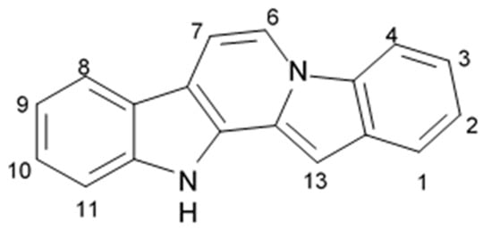 A large group of natural, semisynthetic, and synthetic compounds is presented with tricyclic pyridoindoles, i.e., carbolines, which are classified as α-carbolines (pyrido[2,3-b]indoles), β-carbolines (pyrido[3,4-b]indoles, γ-carbolines (pyrido[4,3-b]indoles) and δ-carbolines (pyrido[3,2-b]indoles) depending on the position of the pyridine nitrogen relative to the indole. β-carbolines initially discovered in Peganum harmala and later widely found in medicinal plants and natural herbal products are the well investigated compounds [66]. Alkaloids composed of tricyclic moiety and structurally relayed to both indole and carbazole compounds belong to the group of α-carbolines. Among the marine species, the representatives of the Tunicata subtype, mostly ascidians, are the source of α-carboline alkaloids [67]. Natural α-carbolines and their synthetic derivatives are of great interest as the lead compounds in the new drug development. α-Carboline related derivatives have been synthesized and experimentally demonstrated to show anticancer activities [68].