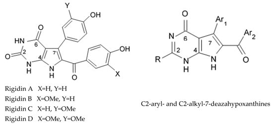 Alkaloids rigidins A, B, C, D, and E initially isolated from the tunicate Eudistoma cf. rigida [77,78] and later synthesized [79] were the most notable ones among the group of pyrrole alkaloids but have been shown to have low activity regarding cultivated human cancer cells. Further investigations of synthetic compounds led to development of the promising approaches to modification of the 7-deazaxanthine skeleton that typical of rigidins converting into corresponding 7-deazahypoxanthines (Figure 4).