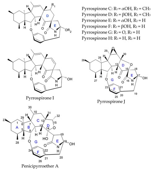 Novel pyrrospirone alkaloids C, D, E, F, G, H, and J as well as penicipyrroether A were isolated from marine fungus Penicillium sp. (ZZ380 strains) generally found in the wild sea crab Pachygrapsus crassipes. These alkaloids along with other chemically related compounds make a family of fungal secondary metabolites, which are also called hirsutellones and contain a unique 13-membered ether ring composed of specific structural units such as decahydrofluorene, para-cyclophane, and pyrrolidinone. That fungal metabolite family were isolated from fungi belongings to the genera Cylindrocarpon, Embellisia, Hirsutella, Lewia, Neonectria, Penicillium, and Trichoderma and are divided into four chemical groups: hirsutellones, pyrrospirones, pyrrocidines, and GKK1032s [80]. Pyrrospirones C and D have the same molecular formula (Figure 5). From the structural point of view, both of them are composed of two carbonyls, six aromatic carbons, two olefin carbons, four quaternary carbons, two oxymethines, one methoxyl, six methines, five methylenes, and five methyls as well as they have closed spiro ring system but different configurations at C-17. In a similar fashion, pyrrospirones E and F have the same molecular formula. The 13C NMR data of pyrrospirones E and F show close similarities with those of pyrrospirones C and D, respectively, except the different chemical shifts for C-19 to C-21 due to the absence of a methoxy at C-19 in pyrrospirones E and F. This indicates pyrrospirones E and F are the analogues of pyrrospirones C and D without methoxyl at C-19. Similar to pyrrospirones C and D, the structural difference between pyrrospirones E and F is related to different C-17 configurations. Molecular formula of pyrrospirones G is two protons less than that of pyrrospirones E. Structural difference between pyrrospirones G and E presented with oxymethine at C-17 in E is replaced by a carbonyl group in G compound. That is 16 mass units less than that of pyrrospirone E. Pyrrospirone H is considered a pyrrospirone E analogue with a methylene attached at C-17. Pyrrospirone I is two protons less than that of pyrrospirone H. The pyrrospirone I structure is considered as analogue of pyrrospirone H with a double bond at C-16 and C-17 [80]. Despite structural parts of rings A–C, F, and G for penicipyrroether A and pyrrospirones C–I are the same, the structures of penicipyrroether A and pyrrospirones have specific differences. First of all, D ring contains five-membered ether ring for penicipyrroether A and cyclohexanone for pyrrospirones. Then, penicipyrroether A does not have spiro junction for rings D and E. NMR spectroscopic data analysis and HRESIMS data (high resolution electrospray ionization mass spectroscopy) demonstrated that compound pyrrospirone J is an analogue of penicipyrroether A with the same structural part of rings A, B, F, and G but possesses an epoxy moiety at C-10 and C-11 and a different five-membered ether ring D fused with ring E through a spiro carbon of C-15. In addition, the dehydro-pyrrolidinone moiety (ring E) in penicipyrroether A is replaced by a pyrrolidinone moiety in pyrrospirone J [81].