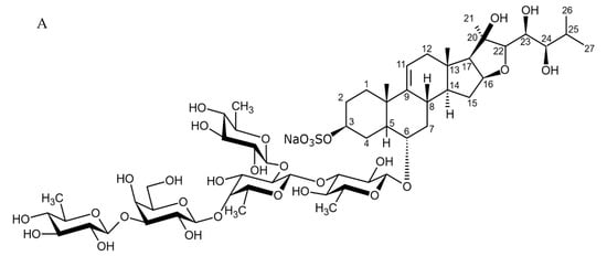 - Yu, S.; Ye, X.; Huang, H.; Peng, R.; Su, Z.; Lian, X.-Y.; Zhang, Z. Bioactive sulfated saponins from sea cucumber Holothuria moebii. Planta Med. 2015, 81, 152–159. [Google Scholar] [CrossRef]