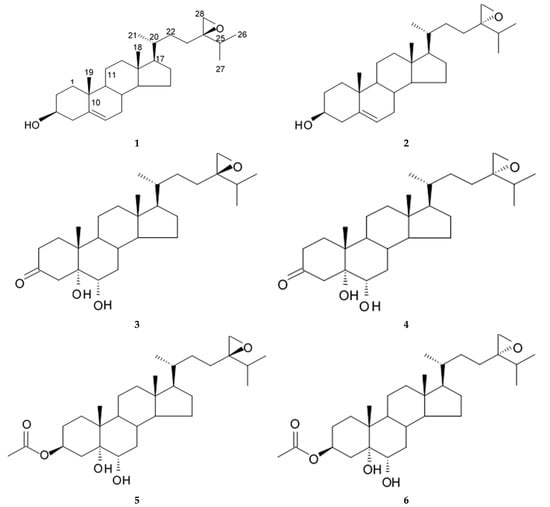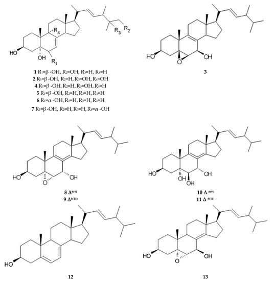 - Yu, S.; Ye, X.; Chen, L.; Lian, X.-Y.; Zhang, Z. Polyoxygenated 24, 28-epoxyergosterols inhibiting the proliferation of glioma cells from sea anemone Anthopleura midori. Steroids 2014, 88, 19–25. [Google Scholar] [CrossRef]