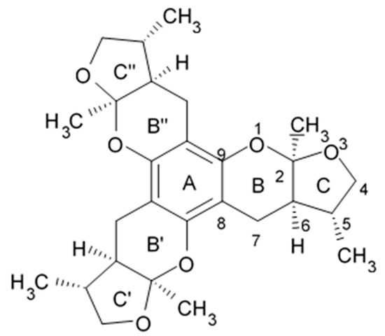 Tetrahydroisoquinoline alkaloids with antitumor activity isolated from marine species are commonly categorized into ecteinascidins and renieramycins. Ecteinascidin-743 (ET-743), which is also known as trabectedin, yondelis, and CID 108150 is the one of the most potent representatives of ecteinascidins, isolated from Carribean ascidian (subphylum Tunicata) Ecteinascidia turbinata [70]. ET-743 was approved as a first line drug for the treatment of inoperable soft tissue sarcoma with high resistance to conventional chemotherapeutics. Mechanism of antitumor activity of the ET-743 is related to its capacity of making complexes with minor groove of DNA double helix and alkylate N2 guanin, thus preventing cell proliferation, DNA reparation, and activation of transcription. This cascade leads in apoptosis of the target cells [71]. Three alkaloids namely ecteinascidin-770 (ET-770, a stabilized derivative of ET-743, isolated from ascidian E. thurstoni), 2′-N-4″-pyridinecarbonyl derivative of ET-770 and renieramycin M, a major bis-1,2,3,4-tetrahydroisoquinolinequinone alkaloid from the marine sponge Xestospongia sp. were tested in human glioblastoma cells U373MG. All tested compounds exerted strong anti-glioma influence at the nanomolar concentrations after a 72 h treatment (Table 5) [72].