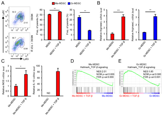 TGF-β increases the immunosuppressive function of MDSCs. (A) Representative FACS plots of MDSCs subpopulations [Mo-MDSCs (Ly6GlowLy6Chigh) and Gr-MDSCs (Ly6GhighLy6Clow)] and bar graphs showing the percentages of each subpopulation. (B) The level of arginase1 mRNA in Mo-MDSCs and Gr-MDSCs after TGF-β treatment. (C) iNOS and IL-10 mRNA levels in Mo-MDSCs after TGF-β treatment under lipopolysaccharide (LPS) stimulation condition. (D) GSEA analysis of microarray data from Mo-MDSCs treated with TGF-β. (E) GSEA analysis of microarray data from Gr-MDSCs treated with TGF-β. Data are expressed as the mean ± SD. ND, not detected. * p < 0.05, ** p < 0.01, and *** p < 0.001 by two-tailed t-test.