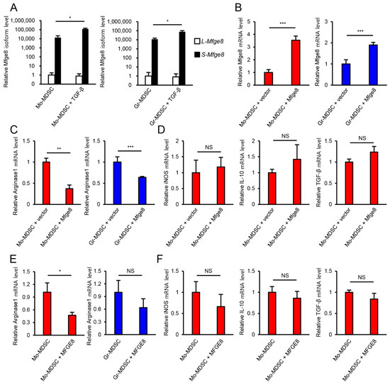 As there are two isoforms of MFGE8, the short isoform (S-MFGE8) and the long isoform (L-MFGE8), we confirmed which isoform is expressed in MDSCs by qPCR before investigating the role of MFGE8 in MDSCs (Figure 3A). S-MFGE8 mRNA was preferentially expressed over L-MFGE8 in both Mo-MDSCs and Gr-MDSCs. Therefore, the following experiments were performed with S-MFGE8.