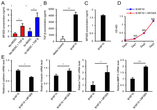 MFGE8 induces EMT of B16F10 melanoma. (A) ELISA of MFGE8 production by Mo-MDSCs and Gr-MDSCs in response to TGF-β treatment. (B) ELISA of TGF-β production by B16F10 melanoma cells. (C) ELISA of MFGE8 production by B16F10 melanoma cells. (D) WST assay of B16F10 melanoma cells in response to MFGE8 treatment. (E) mRNA levels of the EMT markers E-cadherin, vimentin, twist1, and MMP13 in B16F10 melanoma cells treated with MFGE8. Data are expressed as the mean ± SD. NS, not statistically significant (p > 0.05). * p < 0.05, ** p < 0.01, and *** p < 0.001 by two-tailed t-test.