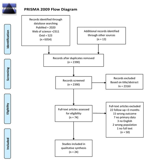 The systematic search retrieved 5054 references and 13 references were identified from other sources such as automatic email alerts on COVID-related databases, reference lists of identified studies, links shared on social media, suggested by a researcher, etc. After removing duplicates, two researchers (DS and KN) screened 2390 titles and abstracts and read in full the text of 74 articles. Both researchers independently reviewed the articles and selected 24 publications that met the inclusion criteria (Figure 1). Primary reasons for exclusion of the studies included; (1) the study did not present the effect of COVID-19 on any of the following outcomes: lung imaging, lung function, respiratory symptoms, fatigue, functional capacity, activity limitations, overall health, quality of life, and/or the ability to return to work; (2) the study was completed in children or in a group of post COVID-19 adults with a specific characteristic or disease (e.g., among patients with diabetes, or kidney problems); (3) the follow-up was less than 3 months; and (4) the article did not present primary data (e.g., protocol, opinion, etc.).