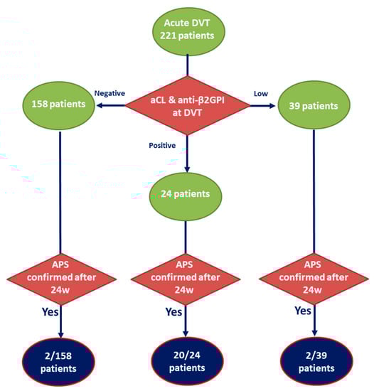 39/221 patients with DVT had low positive values of aCL at the time of DVT. In two of these patients, APS was later confirmed due to their elevation of aCL levels at the subsequent visits.