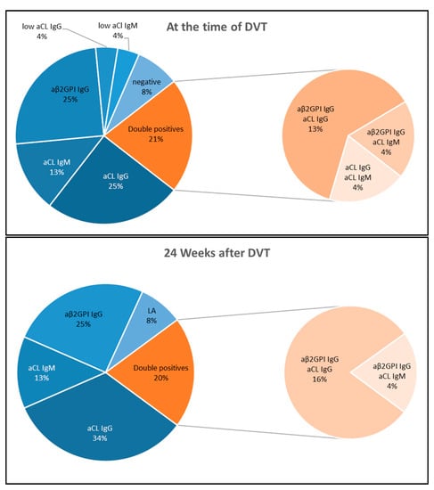aPL profile of APS patients (n = 24) at the time of acute DVT (upper panel) and 24 weeks after DVT (lower panel).