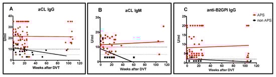 The negative predictive value (NPV) of aPL values determined at the time of DVT (including aCL IgG/IgM and anti-β2GPI IgG/IgM) was 98.0%. Furthermore, the NPV of aPL, counting also aPS/PT IgG/IgM/IgA measurements at the time of the event, increased to 98.4%. The non-APS patient group had significantly lower levels of aCL and anti-β2GPI at the time of the event, and their levels continued to decrease over time, while aPL levels remained high in the APS group (p < 0.001).