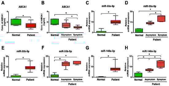 APA StyleJeong, S., Jun, J. H., Kim, J. Y., Park, H. J., Cho, Y.-P., & Kim, G. J. (2021). Expression of miRNAs Targeting ATP Binding Cassette Transporter 1 (ABCA1) among Patients with Significant Carotid Artery Stenosis. Biomedicines, 9(8), 920. https://doi.org/10.3390/biomedicines9080920