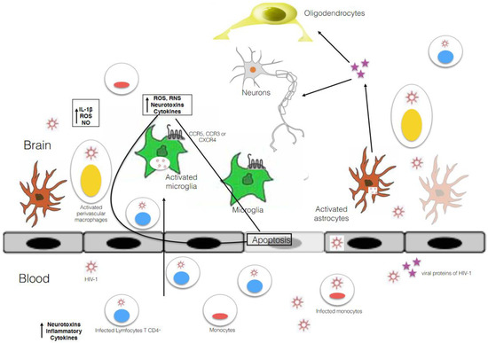 Macrophages or microglia can provoke the release of pr-inflammatory cytokines, including tumor necrosis factor α (TNFα), interferon α (IFNα), interleukin-6 (IL6), interleukin-8 (IL8), and interleukin-1β (IL1β) [6,8,13] (Figure 1), as well as chemokines (C-C motif chemokine ligand 2 (CCL2) and C-C motif chemokine ligand 5 (CCL5), macrophage inflammatory protein 1β (MIP)-1β) [17]. These clues indicate the existence of cellular reservoirs in the CNS established within 3 to 5 days of HIV-1 infection [8], comprising three different types of long-lived infected cells [18]: astrocytes, monocyte lineage cells [19], and microglial cells [20].