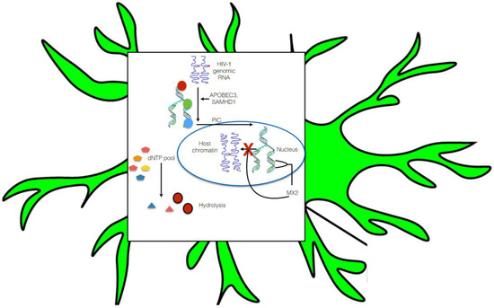 Model of pre-integration latency in HIV-1-infected microglia. Pre-integration latency is controlled by interaction of host restriction factors, including APOBEC3, SAMHD1, and MX2 in the monocyte- or macrophage-lineage cells. APOBEC3 plays a pivotal role in causing G to A hypermutation of the HIV-1 genome. In particular, SAMHD1 reduces the pool of dNTPs in macrophages by hydrolyzing them into their precursors (nucleosides and triphosphates), resulting in ineffective viral reverse transcription. Furthermore, MX2 restricts HIV replication in macrophages and microglia. Moreover, MX2 blocks HIV infection at the post-entry level by hindering the nuclear accumulation and integration of pro-viral DNA into host chromatin.