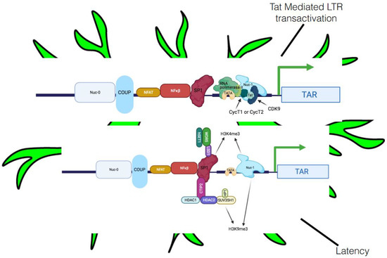 As we previously mentioned, integrated HIV-1 pro-viral DNA is delimited at both ends by the LTR. The 5′LTR has unique blend of a robust TATA box, a potent initiator sequence, and binding sites for several TFs, including the glucocorticoid receptor COUP, USF, activator protein 1 (AP1), TCF-1α, C-Myc, SP1, CTF/NFE, NFAT, NF-κβ, and Tat [52]. In addition, two nucleosomes (nuc-0 and nuc-1) are precisely positioned on the HIV-1 LTR in latently infected cells [52]. Nuc-1 is positioned immediately downstream of a transcription start site and blocks transcription initiation and elongation (Figure 3). These TFs can be crucial for pro-viral DNA expression.