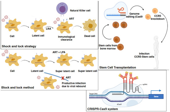 Several methods have been studied as potential strategies to cure HIV, including targeting the CD4 T cell reservoir compartment, which can be redirected to other cellular HIV viral sanctuaries such as a microglial cells (Figure 4).