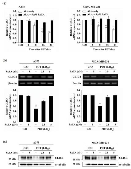 Inhibition of DNA methylation relieves the suppression of CLIC4 expression induced by PDT-mediated oxidative stress. Cells were pre-incubated with 5AZA for 2 h prior to light irradiation. For ALA-PDT, cells were pre-incubated with 1 mM ALA for 3 h and then exposed to specific wavelength (635 ± 5 nm) of light, 2 J/cm2 and 4 J/cm2 for A375 (left panel) and MDA-MB-231 (right panel) cells, respectively. To verify the mRNA expression level of CLIC4, total RNA samples were isolated (a) from PDT-treated cells at the time indicated (4, 8, 16 and 24 h after ALA-PDT) with or without pre-incubation of 5 µM 5AZA, and (b) from PDT-treated cells at 24 h as indicated with or without pre-incubation of 2.5 and 5 µM 5AZA. The relative mRNA expression level of each gene was measured by RT-PCR and normalized to β-actin; (c) The protein expression level of CLIC4 was analyzed by Western blotting, and α-tubulin was used as an internal control. The control group was cells only treated with ALA w/o light irradiation. For electrophoretic gels, the same volume of each PCR product was loaded, and band blots for each gene were cropped from different gels. For immunoblots, equal volume of each sample with the same concentration was loaded into each well, and the blots were cropped from different sections of the same gel. Data represent from three independent experiments. Each bar shown is the mean fold change relative to control ± SD. Results are considered to be statistically significant at * p < 0.05 and ** p < 0.01.