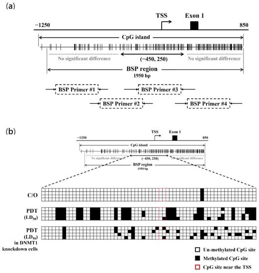 The absence of mutations in the CLIC4 gene during tumorigenesis implies that epigenetic or post-translational modifications may be involved in its expression control. The GC-rich in the CLIC4 promoter region suggests that DNA methylation may play a role in mediating CLIC4 transcription. DNA methylation is one category of epigenetics, which has been defined as the study of stable and heritable alterations of chromatin states and dynamics as well as in gene expression potential but do not attributable to mutations in the primary DNA sequence [,]. DNA methylation occurs via covalently adding of a methyl group to cytosine residue in CpG dinucleotides, which are concentrated in a short stretch of DNA called CpG island. CpG island is defined as a region with at least 200 bp, the proportion of GC content greater than 50%, and observed to expected CpG ratio (O/E) greater than 0.6 []. The CpG islands usually locate in the 5’ end of the candidate genes and nearly 60% of them are in the promoter region [,]. Hypomethylation of regulatory sequences, in general, tends to correlate with an increased gene expression, while hypermethylation is typically associated with transcriptional silencing []. Growing evidences demonstrate that aberrant promoter methylation of genes can be induced by reactive oxygen species [,]. As mentioned, ROS are the major cytotoxic agents responsible for cellular damage induced by PDT [,,]. Although it has been shown that oxidative stress can promote hypermethylation and further suppress gene expression, there are few studies regarding whether PDT-induced oxidative stress may affect DNA methylation. Demyanenko et al. found that 5-aminilevulinic acid (ALA)-mediated PDT alters expression of proteins involved in epigenetic regulation in the mouse cerebral cortex []. However, whether there is any change in DNA methylation in PDT-treated cells remains unknown.