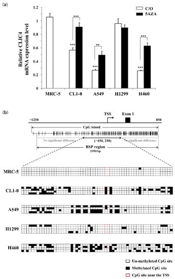 The methylation status of CLIC4 promoter correlates with its mRNA levels in different cell lines. (a) The real-time PCR was performed to analyze the mRNA expression level of CLIC4 in normal lung fibroblast cells, MRC-5; and lung cancer cells, CL1-0, A549, H1299, H460. Cells were treated with or without 5 µM 5AZA for 2 h. To compare the mRNA expression level of CLIC4 in different cell line, MRC-5 cells w/o 5AZA treatment were used as a control group. The relative mRNA expression level of each gene was normalized to GAPDH. Data represent from three independent experiments. Each bar shown is the mean fold change relative to control ± SD. Results are considered to be statistically significant at ** p < 0.01 and *** p < 0.001; (b) Direct sequencing of bisulfite PCR products was performed to explore the methylation status of CLIC4 promoter region. Quantification of the bisulfite-sequencing data, shown as the percentage of DNA methylation (n = 4) of the region among the CLIC4 gene from position nt. −450 to +250. Methylation status of cytosine is shown as follows: filled square (◼), methylated; open square (◻), unmethylated.
