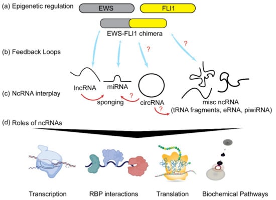 Noncoding RNAs and ES. (a) A chimeric fusion product of EWS and FLI1 genes, EWS-FLI1, exerts epigenetic control by regulating the expression of different classes of ncRNAs (shown as blue arrows). (b) Some ncRNAs also alter the expression of EWSFLI1 as a means of feedback regulation of their own expression levels. (c) ncRNAs have an extensive interplay between each other (shown as red arrows). (d) ncRNAs play roles in regulating transcription, RNA export and transport. They interact with different RNA binding proteins (RBPs), translation and modulating signaling pathways. Red question marks indicate unknown and yet to be explored connections.