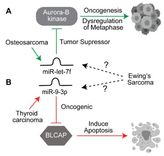 Potential link between miRNAs identified in other cancers. (A) miR-let7f acts as a tumor suppressor miRNA by downregulating the oncogene Aurora B kinase in osteosarcoma. (B) miR-9-3p acts as an oncogenic miRNA by suppressing BLCAP which is required for inducing apoptosis in thyroid cancer. Both of these target genes are similarly affected in ES, but the role of these miRNAs is not yet elucidated in ES. The solid arrows indicate known pathways, the dotted arrows indicate yet to be explored pathways.