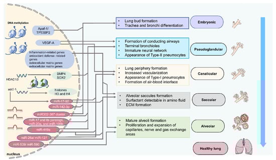 MiR-26a is highly expressed in the rat fetal lung, especially at the saccular stage [59]. The knockout of miR-26a-1/2 in the mouse promoted the formation of dilated lumens and aerated regions at the beginning of the canalicular stage, and maturation of the alveolar structure at the canalicular and saccular stages of lung development [41]. MiR-127 was also highly expressed in the late stage of fetal lung development and regulated terminal bud count and bud sizes in the developing lung [40]. MiR-17-92 can be downregulated by histone acetylation, promoting alveolar type 1 cell spreading and lung sacculation [42]. In the pseudoglandular and saccular stages of rat lung development, let-7a, miR-93, miR-125b-5p, miR-146b, miR-296, miR-1949, and miR-3560 were identified to be consistently expressed in the rat embryonic lungs; while miR-1949, miR-125b-5p, miR-296, and miR-93 were downregulated; and let-7a, miR-146b, and miR-3560 were upregulated [59]. A recent miRNA profiling of human and mouse postnatal alveolar tissue found fifty up- or downregulated miRNAs at the alveolar stage. Significantly, the inhibition of miR-539 and miR-590 markedly reduced alveolar development, with a reduction in radial alveolar count and lung compliance [44]. The above studies support the crucial role of miRNA in lung development and suggest the crosstalk among the epigenetic mechanisms, requiring further investigation.