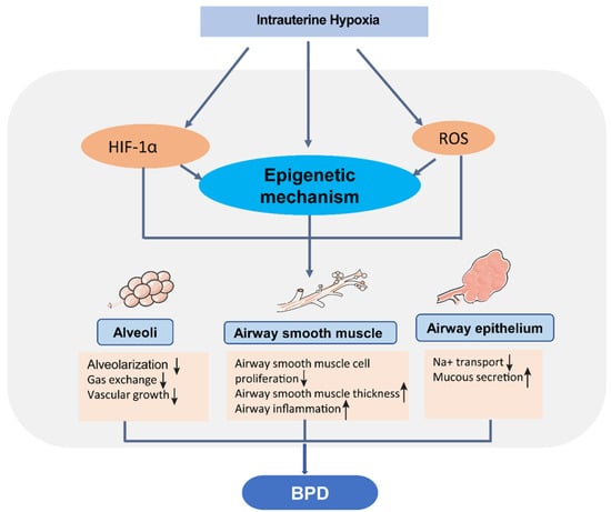 Intrauterine hypoxia, also known as fetal hypoxia, refers to a scenario where the fetus is deprived of an adequate oxygen supply due to environmental, maternal, placental, and fetal factors [1,2,3,4,5,6]. Excessive hypoxia can prevent the fetus from completing its genetically determined growth potential, leading to approximately 10% of babies stunted in the womb and delivered prematurely. The intrauterine hypoxia is involved in perinatal “plasticity,” affecting lung development, injury, and repair processes [6]. Bronchopulmonary dysplasia (BPD) is a multifactorial neonatal chronic lung disease, which is influenced by oxygen and/or intrauterine environment, genetics, immaturity, infection, poor nutrition, and mechanical ventilation. These risk factors are inter-related and interact during fetal development. For instance, prenatal hypoxia followed with postnatal hyperoxia rather than normoxia can exaggerate retardation of morphological lung development leading to BPD-like alterations [7,8]. In addition, excess chronic hypoxia followed by relative hyperoxic exposure, mechanical and infectious stimuli incite oxidative stress, contributing to BPD pathogenesis [9]. ROS can lead to cell apoptosis and dysfunction in alveolar cells, bronchial epithelial cells, alveolar macrophages, and endothelial cells by directly disrupting proteins, carbohydrates, lipids, DNA, and RNA [10]. Additionally, ROS can also trigger epigenetic modifications altering related gene expression patterns [11]. Both direct and epigenetic effects of ROS can cause impaired alveolar and capillary development, boosted vascular permeability and inflammatory responses, and promote the development of BPD [10,12].