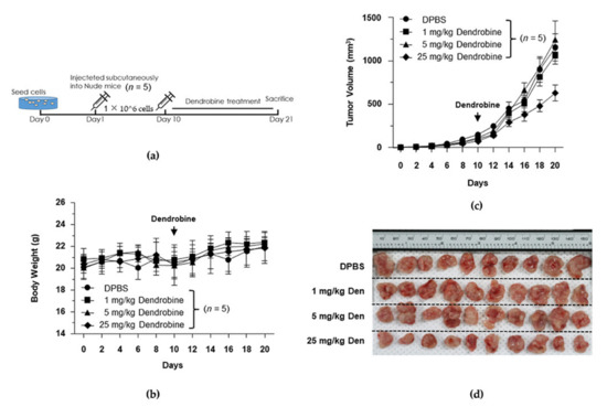 IR-exposed A549 cells (1 × 108 cells/mL) in 10% Matrigel (Corning, NY, USA) were prepared, and then the IR-exposed A549 cells (1 × 106 cells in 100 µL) were transplanted into the flank of six-week-old female BALB/c nude mice. When the tumor reached approximately 80–120 mm3, the mice were randomly divided into four treatment groups (DPBS; 1 mg/kg Dendrobine; 5 mg/kg Dendrobine; 25 mg/kg Dendrobine). The mice were intraperitoneally (ip) injected daily with dendrobine (1, 5, or 25 mg/kg/day) or dulbecco’s phosphate-buffered saline (DPBS) for two weeks. Tumors were measured twice weekly using a digital caliper, and tumor volume was calculated as follows: V (mean tumor volume) = (width2 × length)/2. Mouse body weight was also measured.