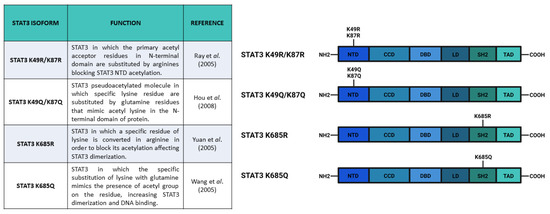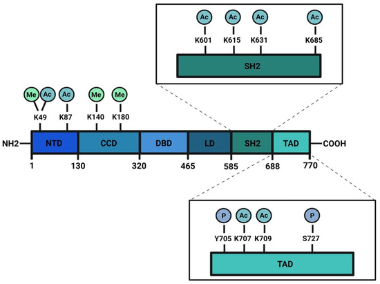 The most studied acetylation of STAT3 C-terminal domain is on the K685 residue. In 2005, for the first time, Wang et al. [65] showed that, in mammalian cells, STAT3 could be acetylated in K685 by its coactivator CBP (p300/CREB-binding protein family). This modification was able to stimulate the sequence-specific binding of STAT3 to DNA and the transactivation of its target genes. They also demonstrated that the inhibition of histone deacetylase activity increased nuclear localization of STAT3. Wang and collaborators transiently overexpressed Stat3 together with CBP or p300 in HepG2 cells, showing that STAT3 + p300 or STAT3 + CBP generated increased levels of acetylated STAT3. They mapped the STAT3 acetylation sites using in vitro acetylation assay and identified K685 as the target of p300. The interaction was confirmed in vivo using FLAG-tagged mutant proteins and performing a transient transfection acetylation assay. They also hypothesized that the acetylation of STAT3 in the nucleus prevents its nuclear export, increases its transcriptional activity, and recruits CBP/p300 on the promoter region of STAT3 target genes, activating their expression. They also supposed that the acetylation of K685 could influence STAT3 phosphorylation modulating the formation of STAT3 dimers.