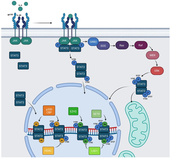 Schematic representation of IL-6/JAK/STAT3 pathway: IL-6 family members recognize their cognate transmembrane receptors and transmembrane proteins associated with the receptors trigger the activation of JAKs. Activated JAKs phosphorylate Y705 of STAT3 and pSTAT3 Y705 migrates to the nucleus. In the nucleus, STAT3 can be acetylated by p300/CBP and methylated by SET9 or by EZH2. HDAC and LSD1 inhibit AcSTAT3 and MeSTAT3, respectively. The Ras/Raf/MEK/ERK pathway determines S727 phosphorylation. Y705 and S727 are both required for mitochondrial functions of STAT3. Alternatively, unphosphorylated STAT3 (U-STAT3) can also regulate specific nuclear targets. Created with BioRender.com.
