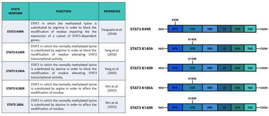 All in all, the evidence mentioned thus far has demonstrated that methylation is fundamental for the regulation of STAT3 activity. MeSTAT3 K49, on the one hand, is induced by pSTAT3 Y705 and potentiates STAT3 transcriptional activity [82]; MeSTAT3 K180, on the other hand, induces pSTAT3 Y705 activating the pathway [83]; and MeSTAT3 K140 negatively regulates a subset of STAT3 target genes [79]. Since STAT3 has a prominent role in tumor growth and progression, the results described above about STAT3 methylation must be considered in studies on STAT3 inhibitors as therapeutic treatments.
