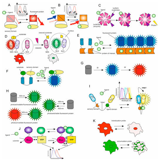 Biosensors classes. Rluc—Renilla luciferase, YFP—yellow fluorescent protein, CFP—cyan fluorescent protein, RA—red copy-A, GA—green copy-A, NLS—nuclear localization signal, NES—nuclear export signal. (A) Class I, type 1. Ligand-binding biosensors work on the principle of increasing or decreasing the fluorescence intensity. (B) Class I, type 2. Ligand binding to the chromophore or conformational modifications causes spectral shifts. (C) Class I, type 3. Ligand binding of biosensors is exhibited by bioluminescence. Binding of ligand to the chromophore causes an intramolecular reaction in which the cofactor (luciferin) is oxidized, leading to photon emission. (D) Class I, type 4. Acting dimerization-dependent fluorescent proteins on the example of intermolecular caspase-3 FPX biosensor. (E) Class I, type 5. BiFC biosensors. If the interaction occurs between two proteins of interest, this will facilitate the reconstitution of the fluorescent protein, forming the fluorescent complex. (F) Class I, type 6. Biosensors based on circularly permuted fluorescent proteins. (G) Class I, type 7. Fluorescent timers. (H) Class I, type 8. Biosensors based on molecular photoswitches. (I) Class II, type 1. FRET-based biosensors. Includes probes where ligand binding changes the FRET efficiency between the two chromophores. (J) Class II, type 2. BRET biosensors, the donor chromophore is a chemiluminescent protein and the acceptor is fluorescent protein. (K) Class III, translocation- or accumulation-based biosensors.