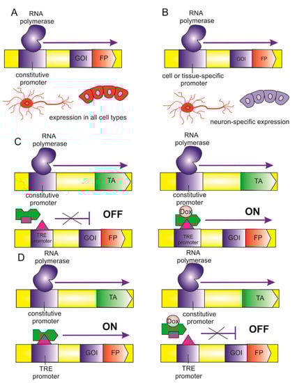 Expression of genetically encoded biosensors. TA—transcriptional activator, TRE—tetracycline responsive element, FP—fluorescent protein, GOI—gene of interest, Dox—doxycycline. (A) Constitutive promoter. (B) Tissue-specific promoter. (C) Doxycycline-inducible expression, the Tet-On system. (D) Doxycycline-inducible expression, the Tet-Off system.