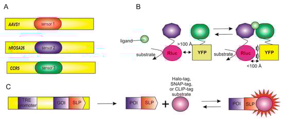 Combination of biosensors. (A) Combination of several biosensors at different safe-harbor loci. (B) Combination of different biosensors types, for example, chemiluminescent protein and the fluorescent protein. BRET. (C) Combination of organic dyes and a genetically encoded protein. SNAP-tag, Halo-tag, and CLIP-tag are composed of a small protein that mediates the covalent binding between the genetically encoded target and the fluorophore.