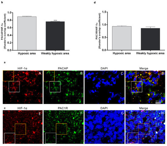 To investigate the peptide and receptor expression in the hypoxic area of the tumor, we analyzed the co-localization of PACAP or PAC1R with HIF-1α on human GMB sections by double-immunofluorescence analysis. In Figure 1, we highlighted with a white square the hypoxic area showing higher HIF-1α expression in contrast to a non-hypoxic area limited by a yellow square representing a region with a weak HIF-1α expression. As shown in Figure 1a,c, PACAP and PAC1R are present in the hypoxic region since they co-localize with HIF-1α, the hypoxia biomarker. However, the peptide and receptor were also detected in the non-hypoxic areas showing a weak HIF-1α expression. To quantify PACAP and PAC1R expression in hypoxic or non-hypoxic area, we performed analysis of immunofluorescence signals by using Pearson correlation coefficient and the Mander’s overlap coefficient. As shown in the graph bar of Figure 1b, PACAP/HIF-1α colocalization was markedly reduced in the non-hypoxic GBM area as compared to hypoxic area (*** p < 0.001 vs. hypoxic area). No significant difference was detected in PAC1R/HIF-1α colocalization in hypoxic or weak hypoxic GBM area.