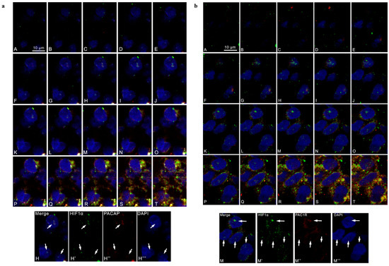 To further deepen our analysis, we evaluated the co-localization of HIF-1α and PACAP or PAC1R in cells co-expressing them. The serial section confocal microphotographs reported in Figure 2 allowed us to visualize the sub-cellular co-localization of PA-CAP/PAC1R and HIF-1α in the nucleus (Figure 2, panel a A–H; Figure 2, panel b A–I), perinucleus (Figure 2, panel a I–M; Figure 2, panel b J,K) and cytoplasm (Figure 2, panel a N–T; Figure 2, panel b L–T). As expected, HIF-1α immunoreactivity was detected in all cellular compartments of tumor cell (Figure 2, panel a and b). Interestingly, the double-immunofluorescence analysis showed a cytoplasmic, perinuclear and nuclear co-localization of HIF-1α/PACAP (Figure 2, panel a) or HIF-1α/PAC1R (Figure 2, panel b), confirming a close association among PACAP/PAC1R expression and hypoxic micro-environment. To better visualize the signal of the peptide and the relative receptor, in microphotograph H’’ was highlighted nuclear localization of PACAP, whereas microphotograph M’’ reported nuclear localization of PAC1R and their merging signal with HIF-1α.