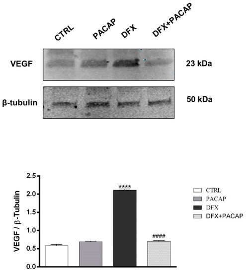 To characterize the functional role of PACAP and its receptor on neo-angiogenesis induced by the hypoxic tumor micro-environment, we investigated the effect of the peptide on U87MG cells exposed to DFX. In our previous work, we have demonstrated that PACAP treatment reduced HIF-1α expression in U87MG cells exposed to DFX-induced hypoxia [17]. Since neo-angiogenesis process triggered by low oxygen tension levels is closely associated to VEGF production and release, here we investigated whether PACAP interfered with VEGF expression and secretion in U87MG cells exposed to hypoxic mimetic agent, DFX. As shown in Figure 3, the expression of VEGF was significantly increased in GBM cells following the hypoxic insult (**** p < 0.0001 vs. CTRL). The peptide treatment induced significant reduction of intra-cellular VEGF levels in hypoxic condition (# p < 0.05 and #### p < 0.0001 vs. DFX). Hypoxia mimetic condition also increased secretion of VEGF in supernatant of U87MG cells (**** p < 0.0001 vs. CTRL; Table 1), whereas PACAP treatment significantly reduced the growth factor releases in culture medium as demonstrated by ELISA assay (### p < 0.001 vs. DFX; Table 1).