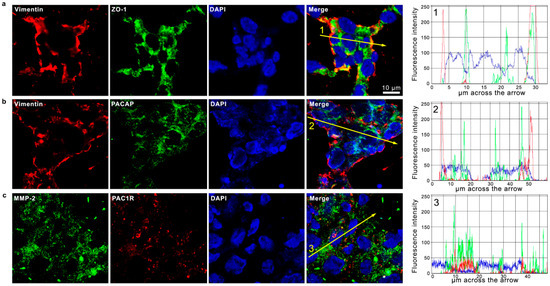 Co-expression of PACAP and PAC1R with EMT-related markers in human GBM sections. Representative photomicrographs showing the cellular co-localization of Vimentin (red) with ZO-1 (green) (a); Vimentin (red) with PACAP (green) (b); and MMP-2 (green) with PAC1R (red) (c). Nuclei were stained with DAPI (blue). Photomicrographs are representative results of fields taken randomly from each slide and scanned by confocal laser scanning microscopy (CLSM; Zeiss LSM700). The graphs indicate the measured fluorescence intensity of the single channels across the arrow, allowing us to visualize the specific peaks of single the proteins or their co-expression detected by overlapped signals. Fluorescence intensity graphs were obtained with ZEN-20210 software.