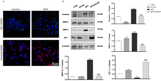 To investigate the functional role played by PACAP on EMT process hypoxia induced, we have studied its effect on U87MG cells exposed to DFX. As shown in Figure 6a, the cell culture included different cell phenotypes, considering that some cells expressed ZO-1, whereas others expressed vimentin. The exposure to DFX induced the EMT event in U87MG cells, as demonstrated by the increased expression of vimentin in contrast to the down-regulation of ZO-1. To investigate whether PACAP was able to counteract the EMT event, we analyzed the expression of some specific markers in GBM cells treated with the peptide and exposed to hypoxia mimetic condition. As shown in Figure 6b, the U87MG cells after DFX insult exhibited higher expression of EMT markers including vimentin, MMP-2 and MMP-9 as compared to control (**** p < 0.0001 vs. CTRL). On the contrary, low levels of ZO-1 epithelial marker were detected in DFX group (** p < 0.01 vs. CTRL). The treatment with PACAP of cells grown under hypoxia mimetic condition significantly decreased the expression of vimentin, MMP-2 and MMP-9, with a simultaneous increase in ZO-1 expression respect to DFX group (#### p < 0.0001 vs. DFX) (Figure 6b).
